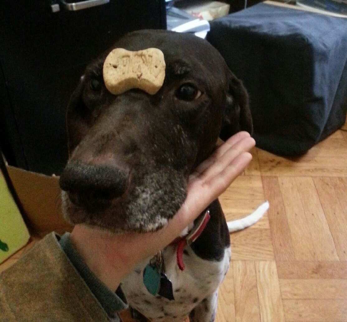 Cute as it was, I did not believe it. Surely the second his hand moved, she would drop the cookie. Surely he had to be reaching his breaking point with ‘sit’ and ‘stay’. Who in their right mind would try to add “Don’t move while I place the most important thing in your world, a treat, right where you can see it, but you’re not allowed to eat it.”