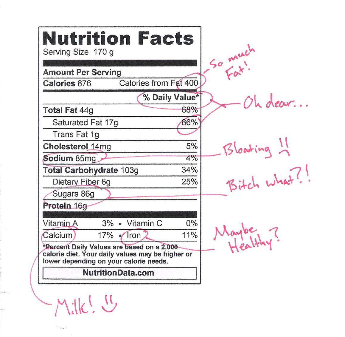I saw an ad on TV in which they tried to get people to stop smoking by showing them a picture of their lungs after smoking for several years. This gave me a great idea. I would look at the nutritional facts on the bag as a way of “Scaring myself straight.” Below are my findings.