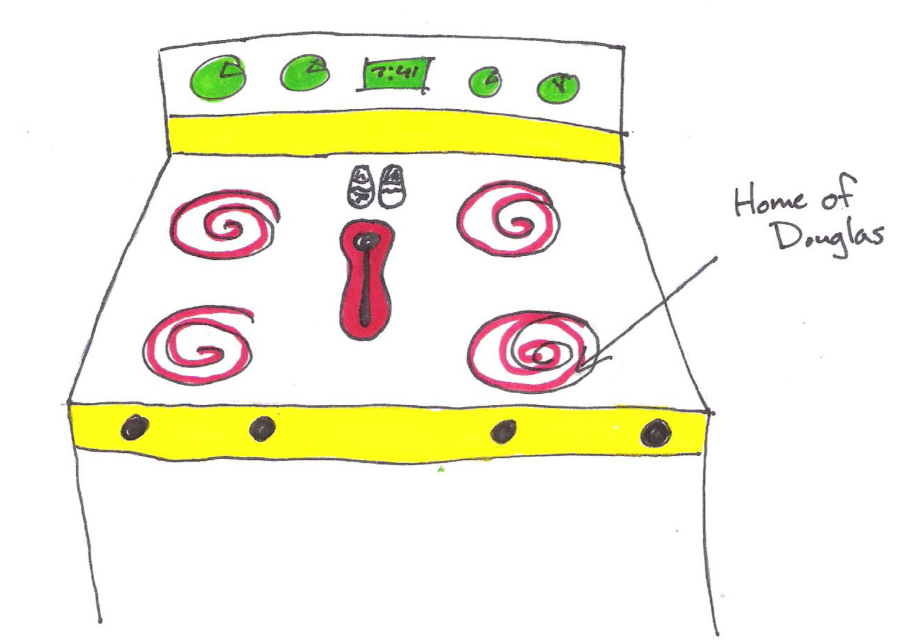 One night, while living with my old roommate, Carina, I was working at my computer. The kitchen was set up so that across from the stove and counters was a nice large bar area, where I preferred to do my writing. It was right underneath a skylight and therefore had a lovely ray of natural sun. As I worked, I happened to look up, possibly contemplating the story at hand, possibly adhering to my attention deficit disorder, and there on the stove, as if nothing was out of the ordinary, was Douglas.