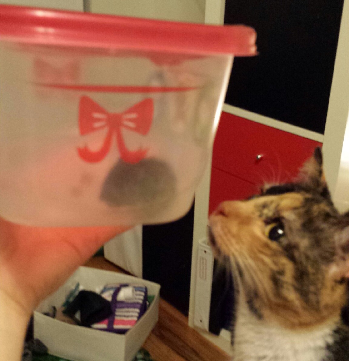 One night, while out of the house, I received a text from Carolyn: DOUGLAS HAS RETURNED. He had found his way into her hamper and now Eeeva, her cat, was chasing him around the room. Carolyn went to find a tupperware container. Not wanting Eeeva to bite him and get a disease and also not wanting to have a horrific scene, involving our fourth roommate, occur in her bedroom, she had decided to try and capture Douglas once and for all.