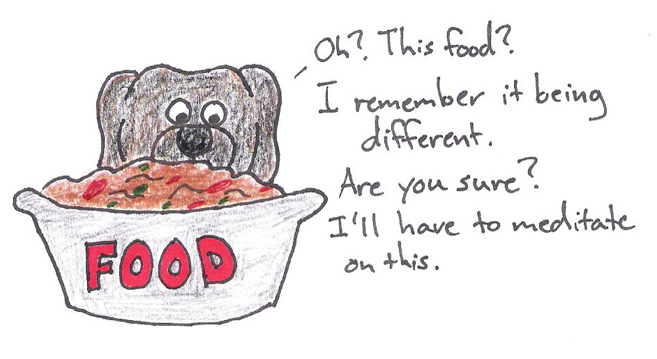 One: Acts Hungry. Gets excited at prospect of food. Gets food. Stares at it and does not eat.