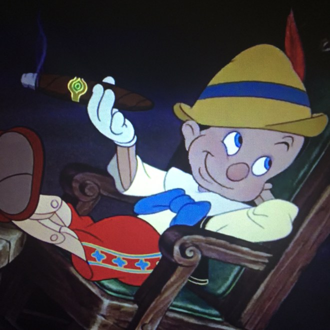 Where was I? Oh right. How can we talk about Pinocchio without mentioning all the contraband that would never be found in a children’s film today. Honest John lights up a big ol’ cigar the first time we see him and later we see his kitty friend Gideon drinking tons of beer and puffing smoke circles. This is bad enough but at least they’re villains. Right?