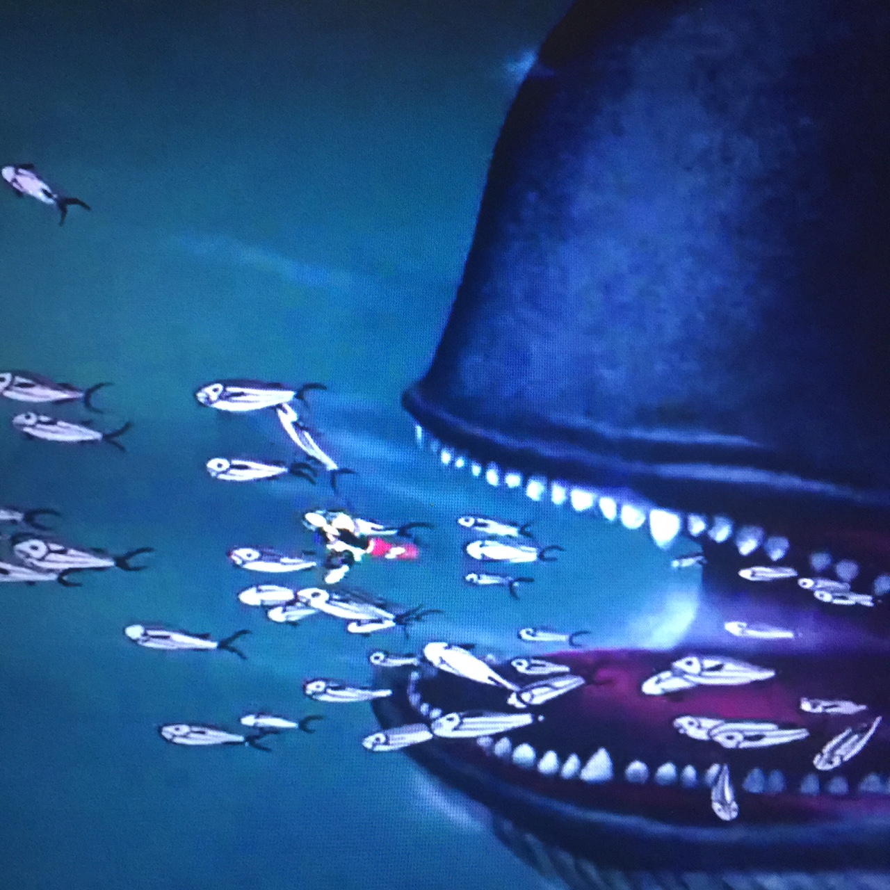 Easily the most visually impressive scenes of this film are those involving the underwater search for Geppetto and Co. as well as the interior of Monstro the Whale and the chase that ensues. The film won awards for the hand animation of this stunning water, which puts even some CGI water to shame. Monstro is a fearsome foe and rightfully so as Pinocchio must stand up to the scariest creature of all in order to be deemed brave enough to be a real boy. He does this, saving Geppetto, Figero and Cleo, all while still sporting donkey ears and a tail.