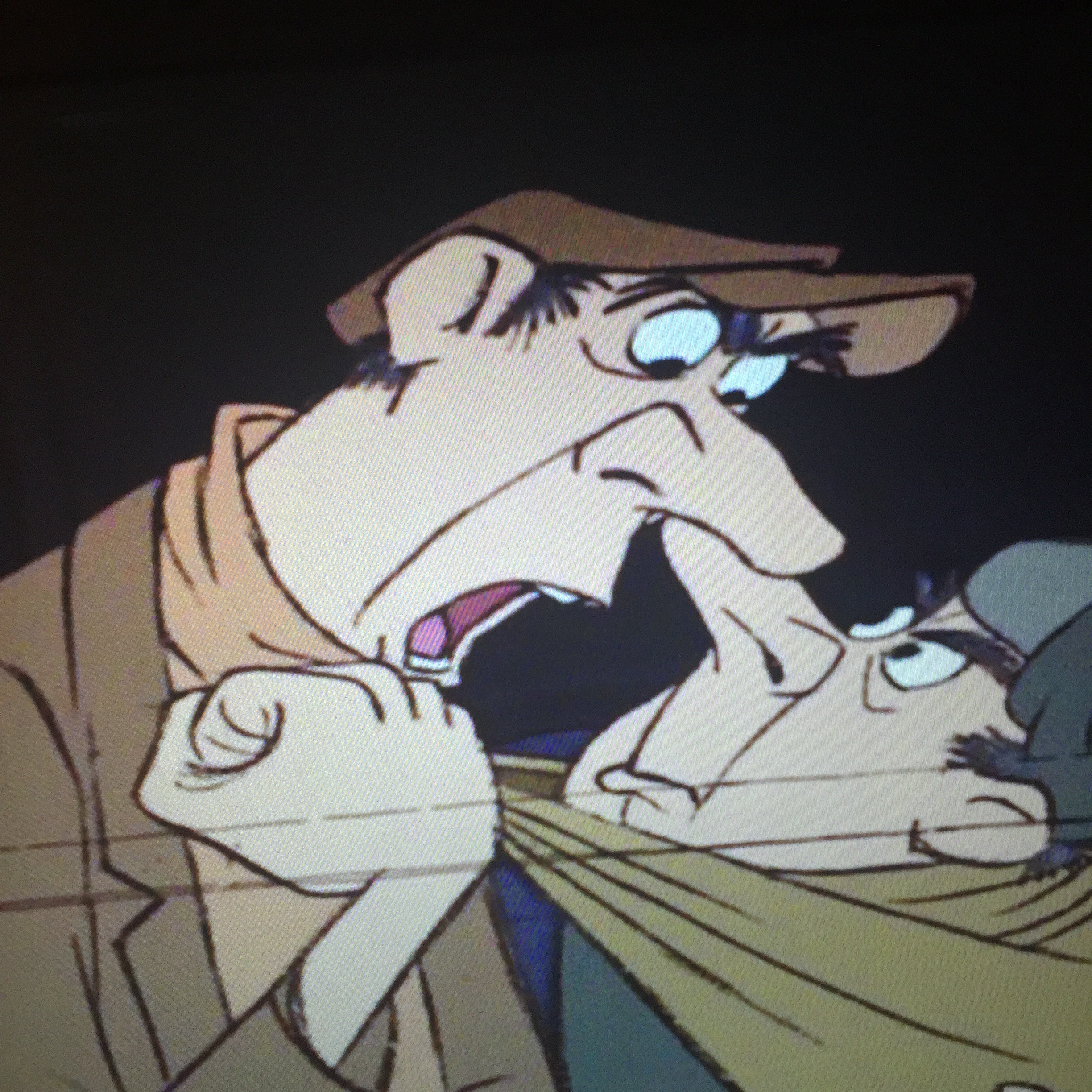 That reminds me, Horace and Jasper are quite a pair. They’re definitely some of the roughest folks we’ve found in a Disney film so far. They spend most of the movie smoking and drinking, though let’s be honest, the only person not smoking up a bad case of lung cancer in this movie is Anita. Horace and Jasper are interesting because not only are they villainous towards our heroes, but they are also villainous towards each other, hitting each other and bullying each other. At one point, Jasper actually puts cigarette ash into Horace’s sandwich. Seriously Horace, there are better friends out there. Again, I love the movement of these two, especially the way Jasper walks, like he’s tired or his legs are crooked. It has such a great authenticity about it.