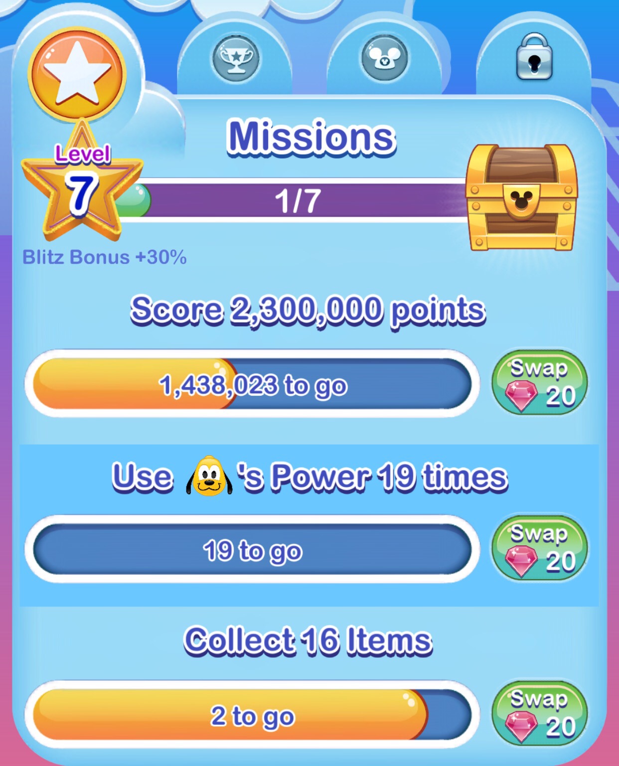 7. How do you I use the Stitch power 19 times? I had the same problem with Pluto and Simba but used my jewels and would prefer to understand the game? Mickey is ALWAYS at the bottom left of the screen when playing. I am on level 9 for reference.
