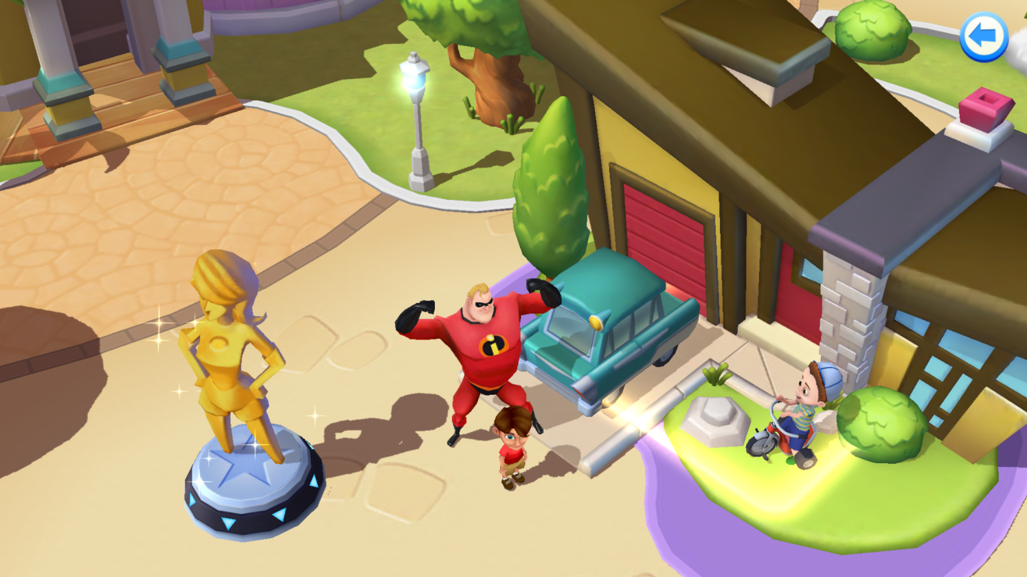 Aw, the quaint home of The Incredibles. Why, look here, it seems Mr. Incredible is showing off for us. You would think that the golden statues outside his home would be enough, but no, he feels the need to lift a car repeatedly. He’s simply so heroic, or possibly just a big show off. Either way, next door is one of our newest attractions, the Jetpacks. It’s a lovely little spinning ride that’s great for the whole family.
